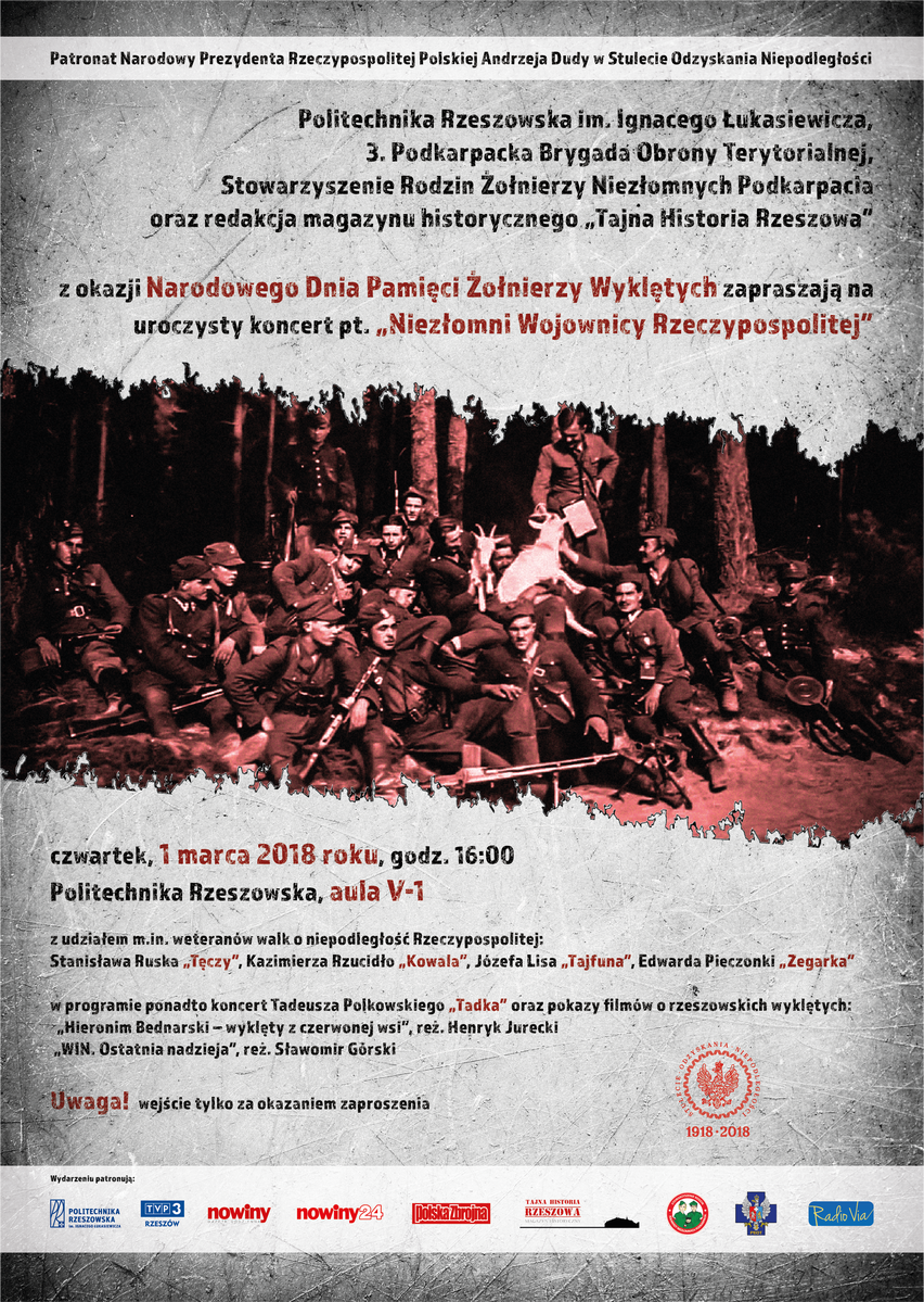 Politechnika Rzeszowska, dowództwo 3. Podkarpackiej Brygady Obrony Terytorialnej, Stowarzyszenie Rodzin Żołnierzy Niezłomnych Podkarpacia oraz redakcja magazynu historycznego „Tajna Historia Rzeszowa” organizują koncert „Niezłomni Wojownicy Rzeczypospolitej”, który w czwartek 1 marca br. rozpocznie się w auli V-1 o godz. 16:00.