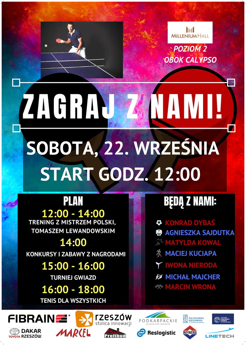 Event  „Zagraj z nami”  skierowany jest do wszystkich osób, które lubią grać w tenisa stołowego, i do tych którzy chcą się tej gry nauczyć. Każdy będzie miał okazję spróbować swoich sił w tym sporcie.