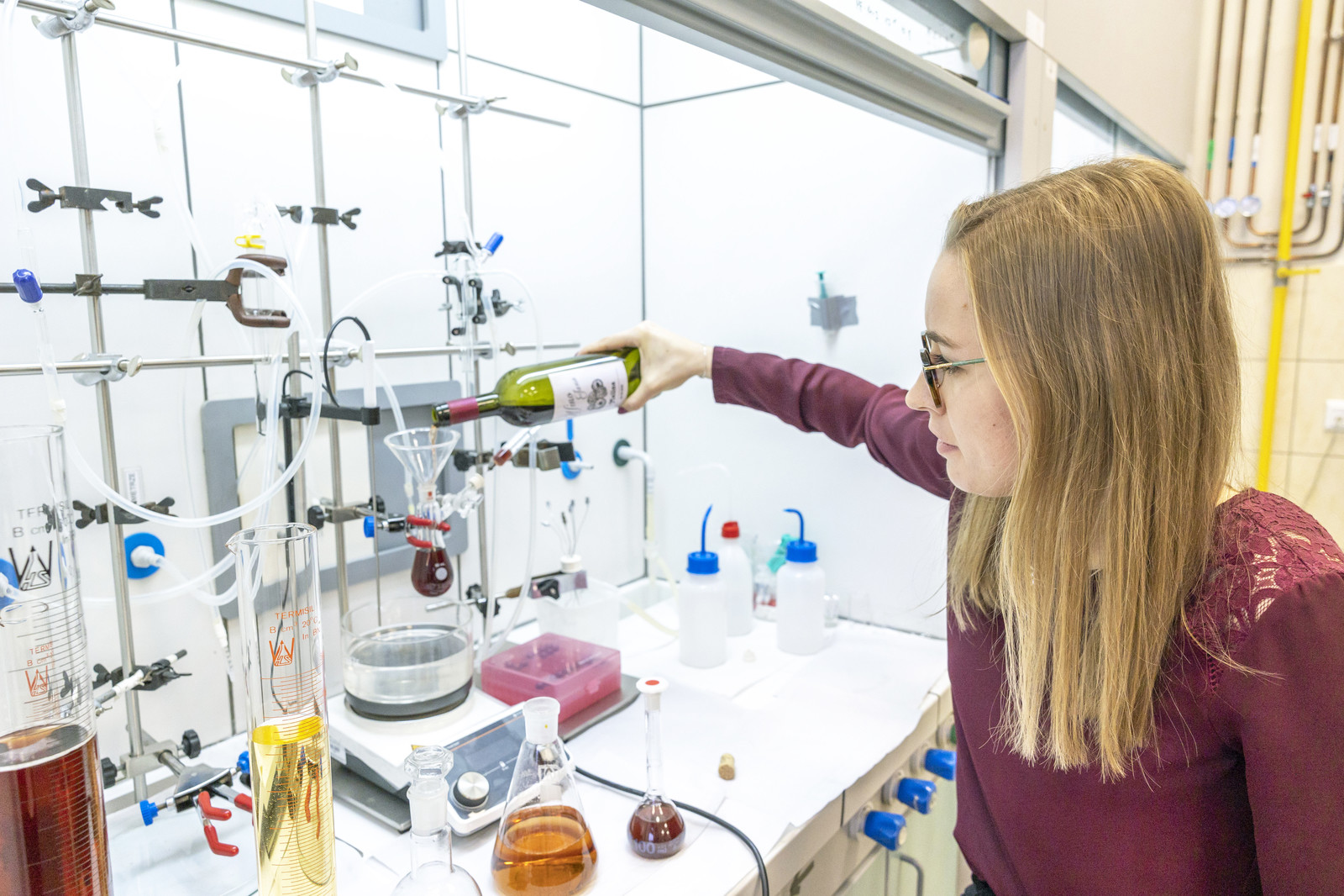 „Stosowana przez nas w badaniach technika polimeryzacji rodnikowej z przeniesieniem atomu (ATRP) została wynaleziona i opisana w 1994 r. przez prof. Krzysztofa Matyjaszewskiego i od niemal trzydziestu lat prężnie się rozwija. W laboratorium grupy badawczej prof. P. Chmielarza pracujemy nad udoskonaleniem tej metody, opracowaniem jej nowych wariantów oraz wykorzystaniem do syntezy polimerów o ściśle określonych właściwościach i wysokim potencjale aplikacyjnym, m.in. w implantologii czy w przemyśle produkcji powłok. Stojąc przed wyzwaniem doboru odpowiedniego rozpuszczalnika do syntezy związków hydrofobowych, zainspirowani zasadami zielonej chemii postanowiliśmy przeprowadzić polimeryzację z wykorzystaniem niekonwencjonalnego rozpuszczalnika, jakim jest wino” – mówi mgr M. Flejszar